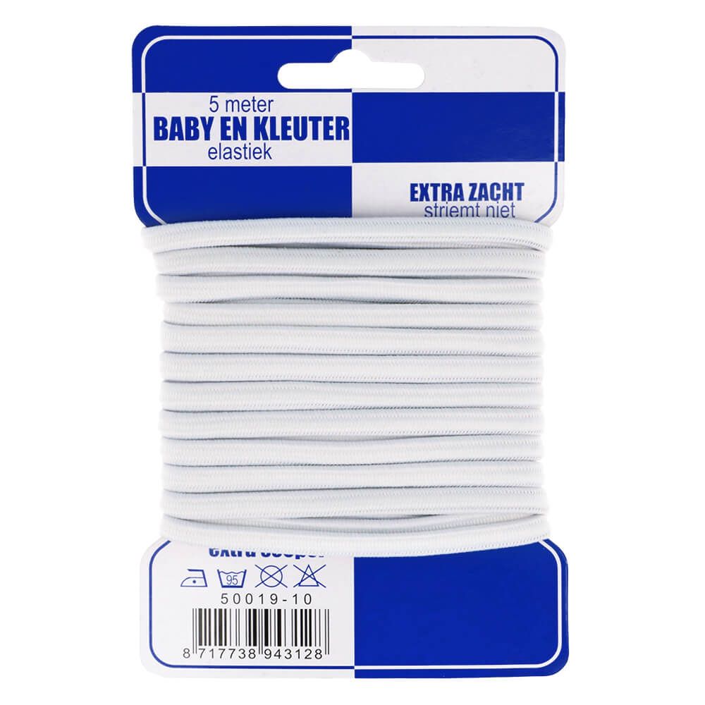 Baby- en kleuterelastiek is extra soepel en extra zacht, waardoor het vriendelijk is voor de huid en geschikt is bij extra gevoeligheid voor druk. Dit elastiek is kookecht en striemt niet. Het elastiek is wasbaar tot 95°C. Een verpakking bevat 5 meter elastiek.