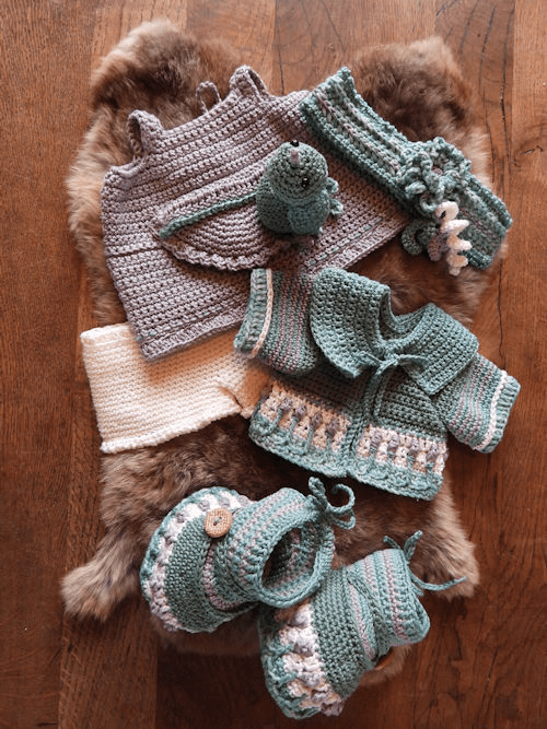 Haakpakket voor het haken van deze Funny kledingsetBirdy grey. Dit haakpakket bevat al het benodigde garen, vulling, accessoires en patroon. Excl. haaknaald